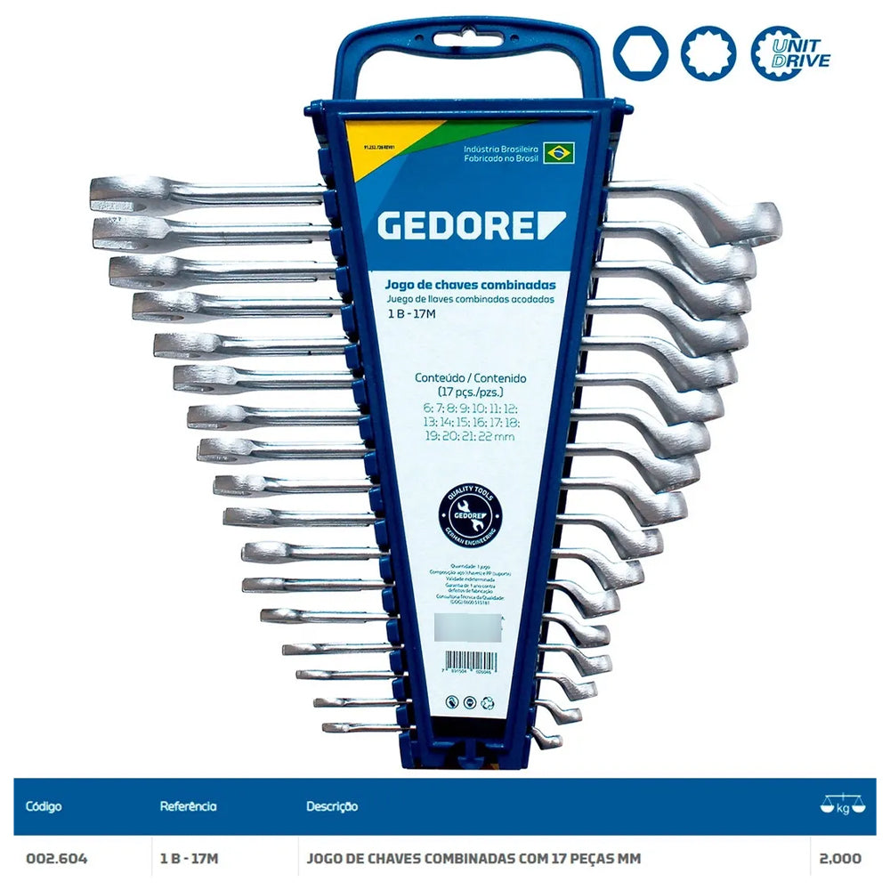 Jogo de Chaves Combinadas de 6 a 22mm com 17 Peças 1B-17M - Gedore