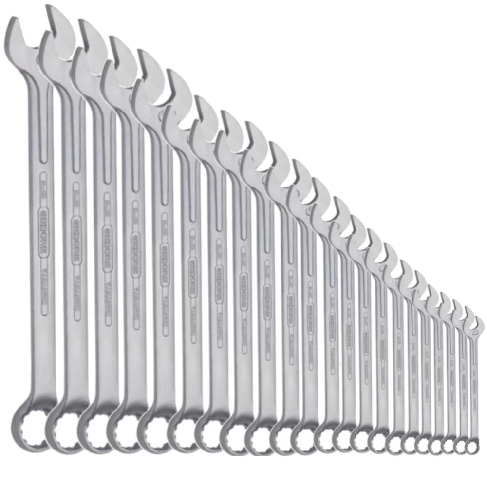 >17 chaves combinadas nos tamanhos: 6, 7, 8, 9, 10, 11, 12, 13, 14, 15, 16, 17, 18, 19, 20, 21 e 22 mm.