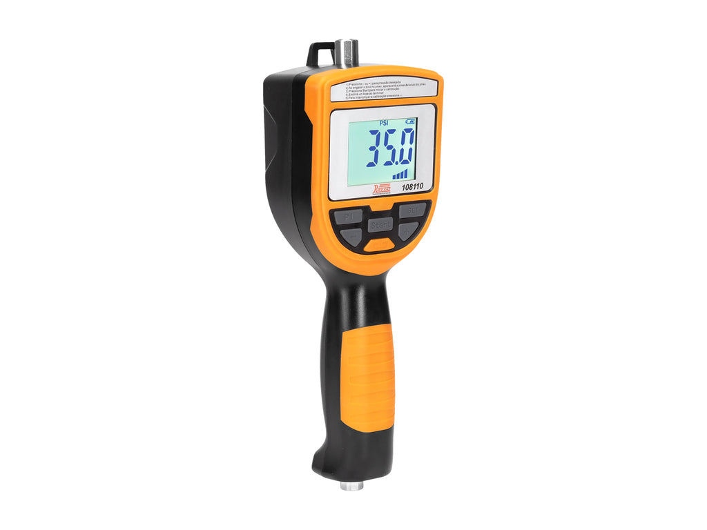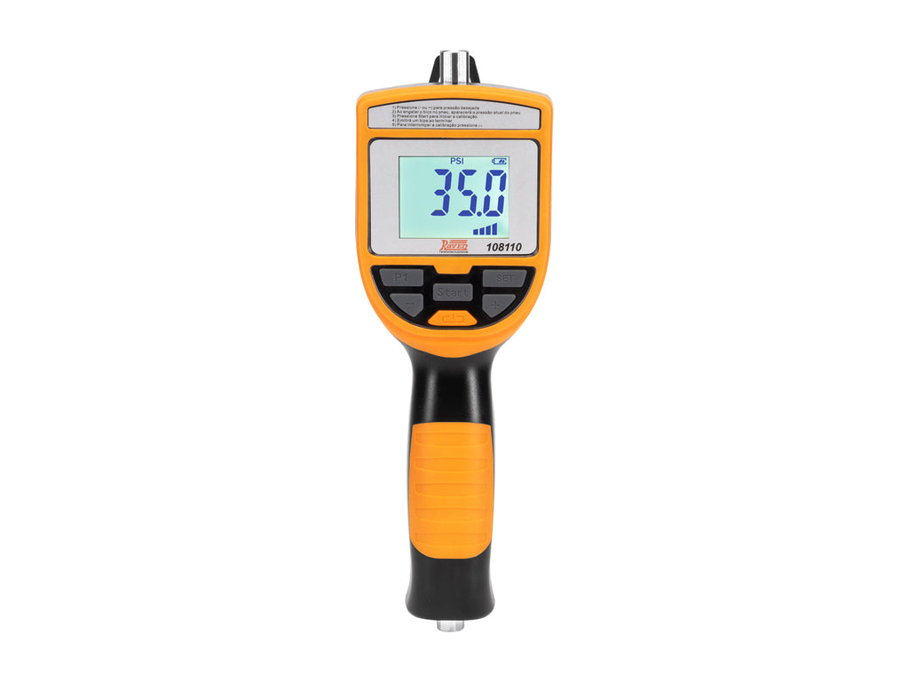 d) Operação simples e funcionamento automático: ao ser conectado ao pneu, o 108110 mostra a pressão presente no mesmo, e basta selecionar o valor de pressão desejado e apertar o botão Start para iniciar a pressurização ou despressurização do pneu.
