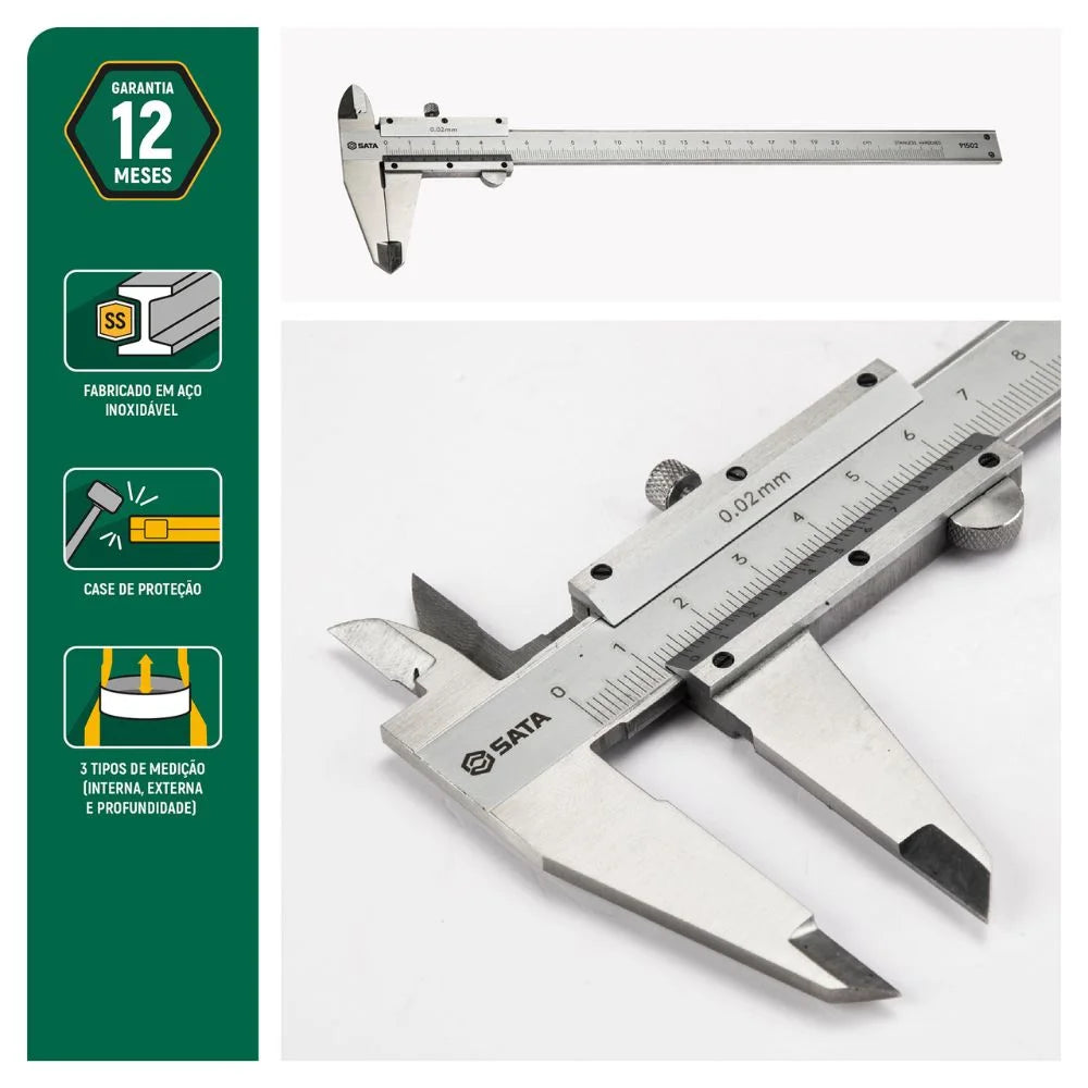 Paquímetro Analógico SATA 0-300MM- ST91503SC oferece 3 tipos diferente e medição com fabricação em aço inox para máxima resistência. Escalas de graduação em mm e polegadas gravadas a laser facilitam a leitura durante as medições. Ideal para uso profissional oferece três tipos de medições diferentes: interna, externa e profundidade. Atendendo as necessidades para diferentes tipos de projetos para medir com precisão as dimensões de pequenos objetos. Acompanha case para transporte, proteção e armazenamento da ferramenta, fabricado em polipropileno.