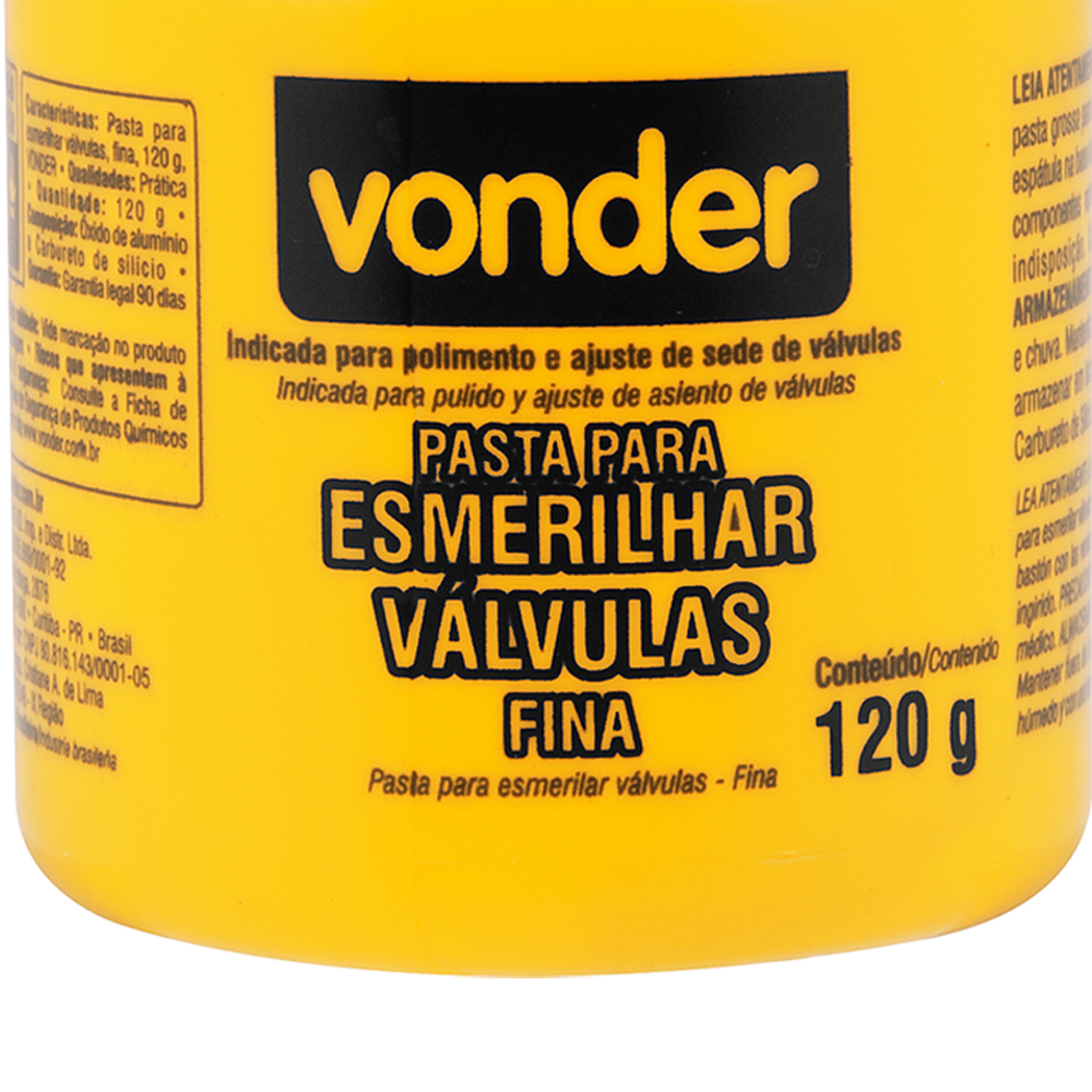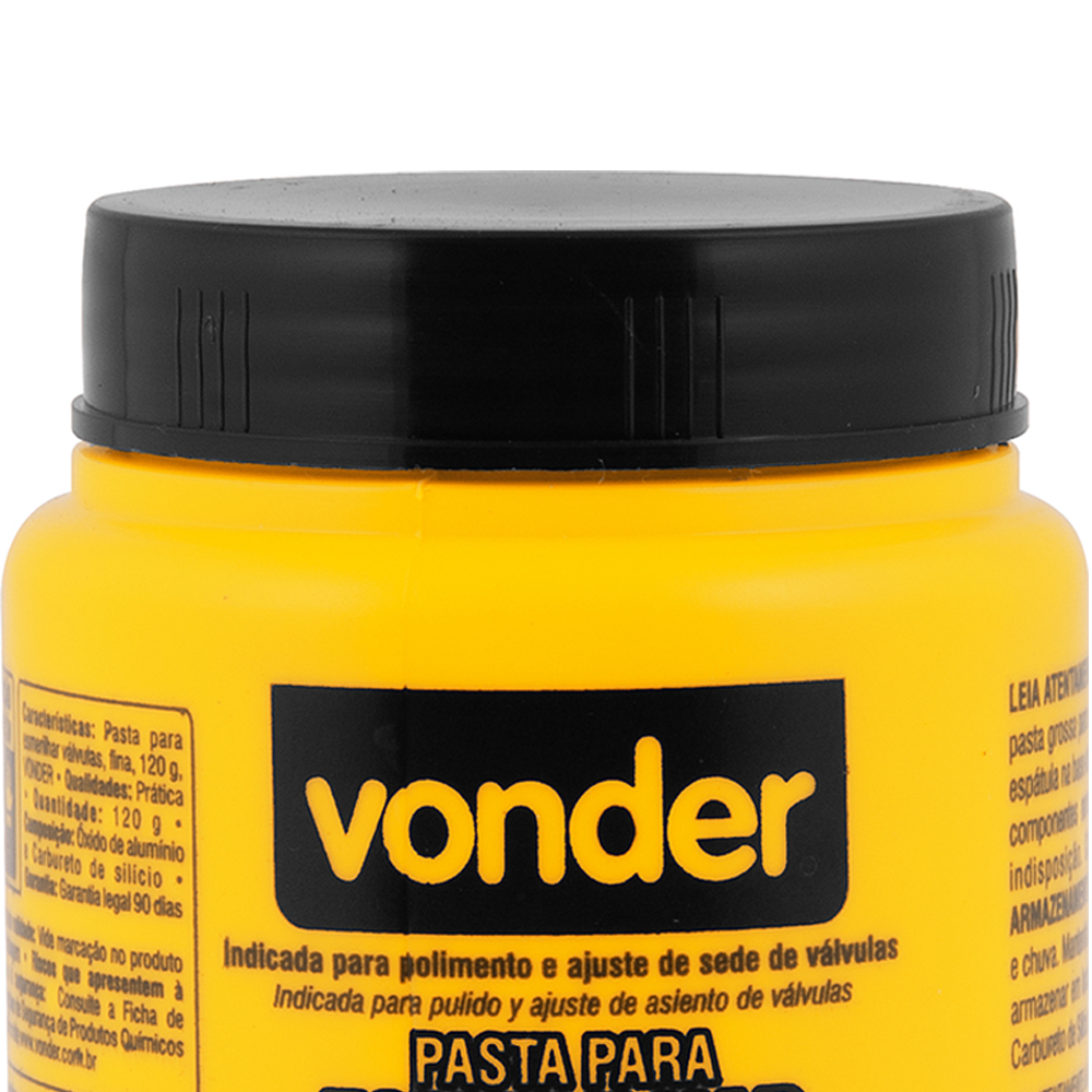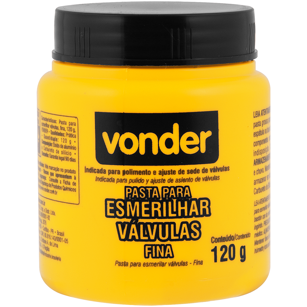 A Pasta para Esmerilhar Válvulas Fina 120g da Vonder é ideal para o polimento e ajuste de sede de válvulas. Esta pasta especial contém abrasivos selecionados que favorecem o perfeito assentamento das válvulas do cabeçote, sem alterar as dimensões da válvula, sem riscar ou desgastar o metal.