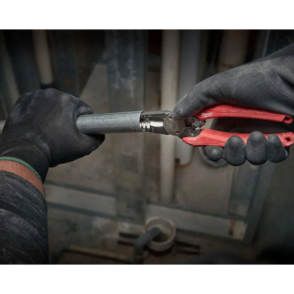 As lâminas de corte curvas permitem cortes limpos em fios de maior diâmetro, enquanto o rebarbador integrado suaviza bordas de tubos metálicos de 1/2" a 1".