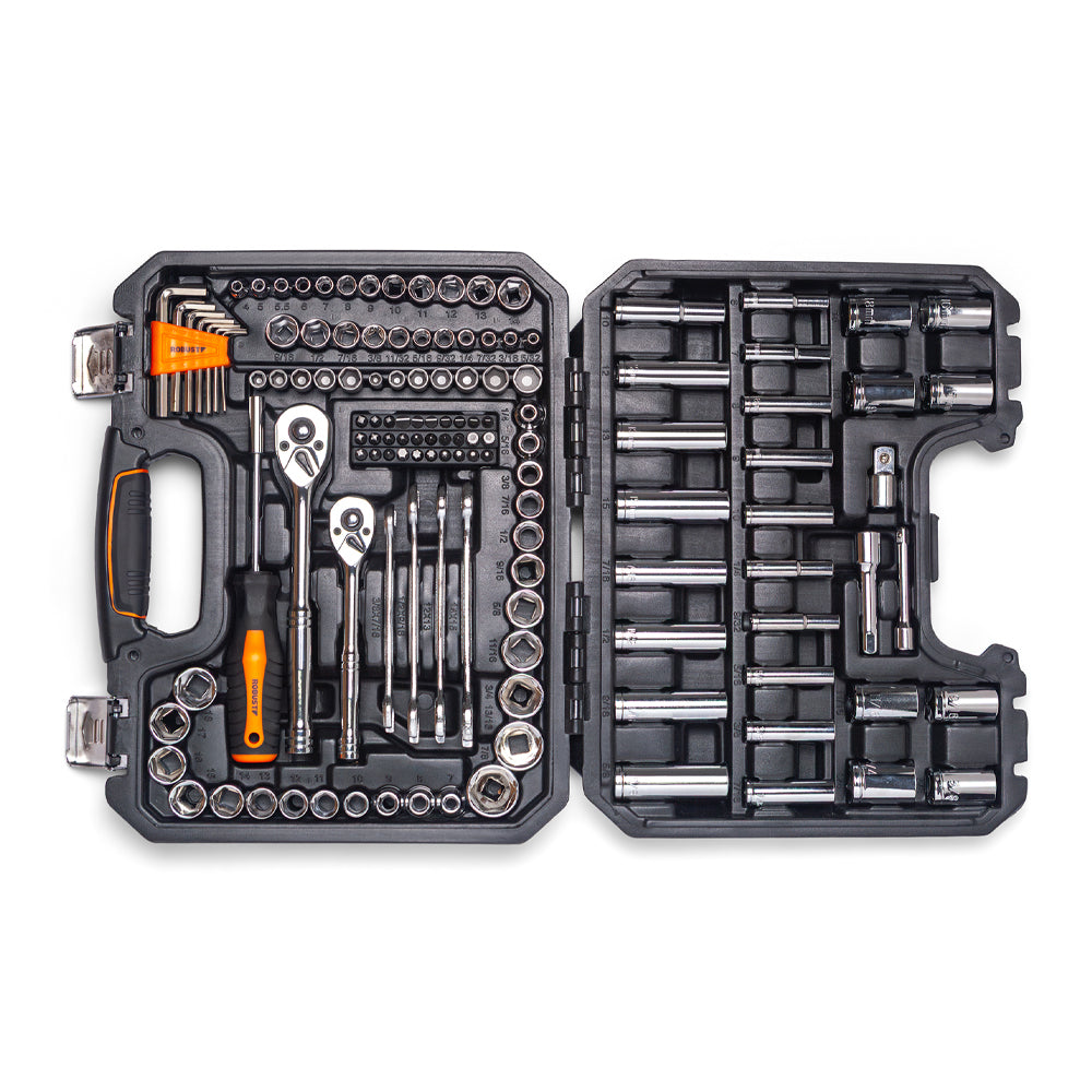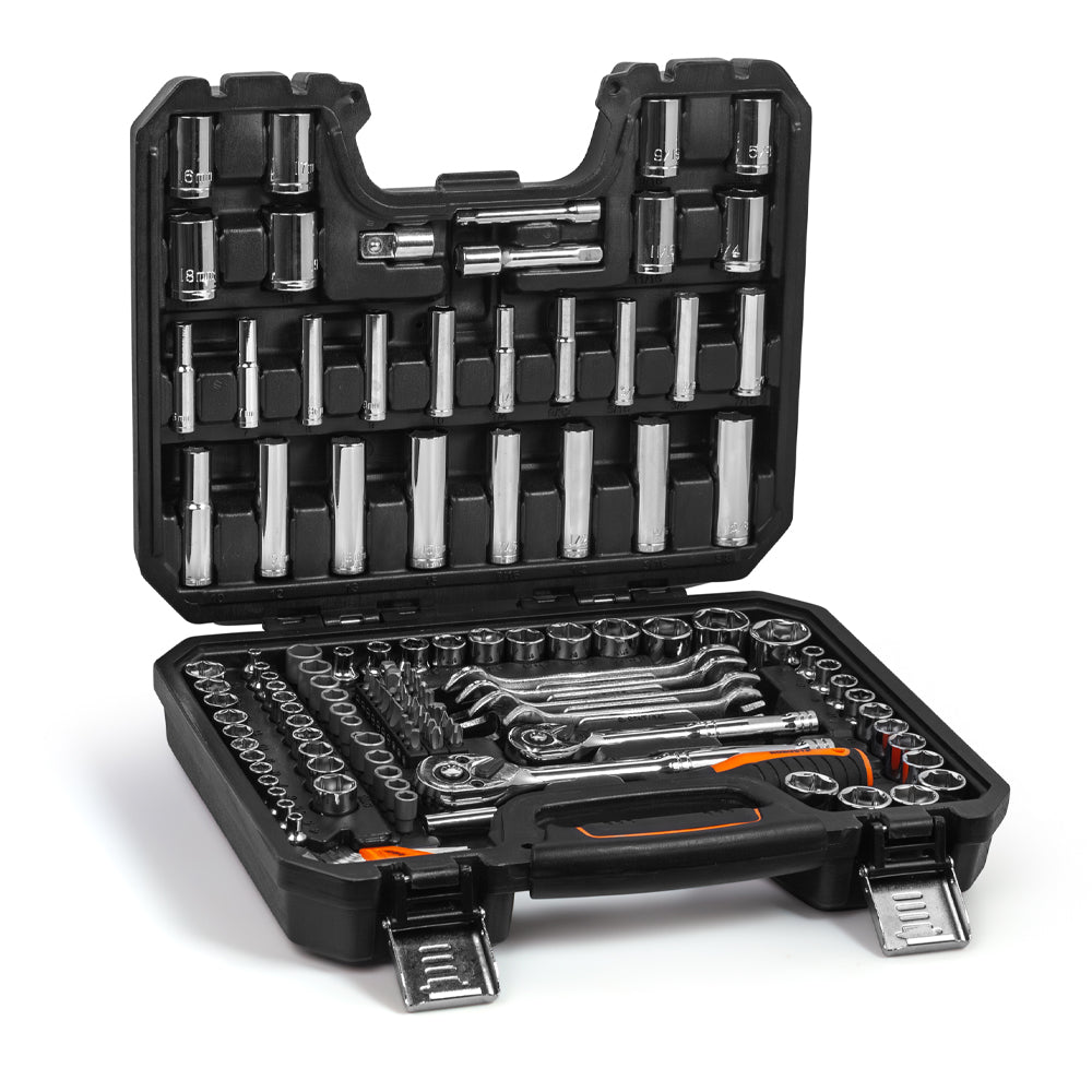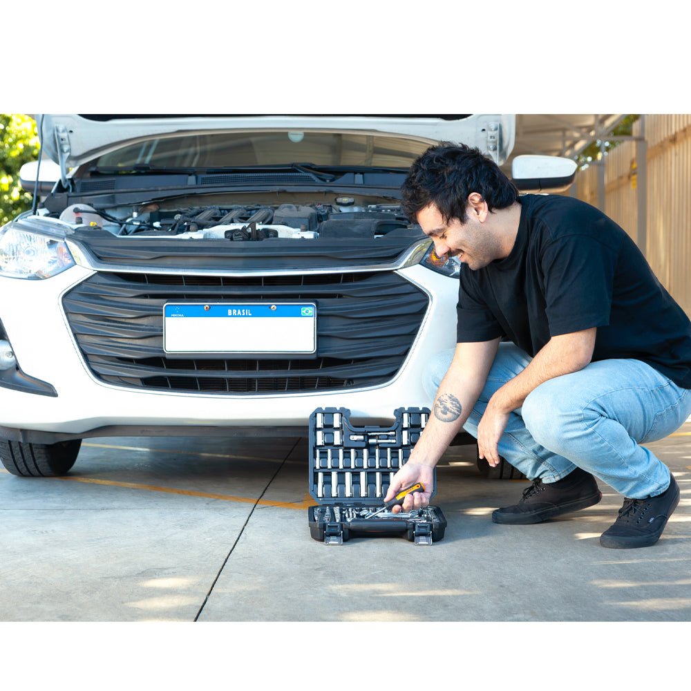 Jogo com 138 peças que abrange encaixes de ¼", 3/8" e ½", combinando medidas milimétricas e em polegada para ampliar as possibilidades de aplicação. O conjunto inclui soquetes longos, chaves fixas, bits, catracas, extensões e adaptadores, oferecendo uma solução completa com excelente custo-benefício para oficinas, profissionais e hobbistas exigentes.
