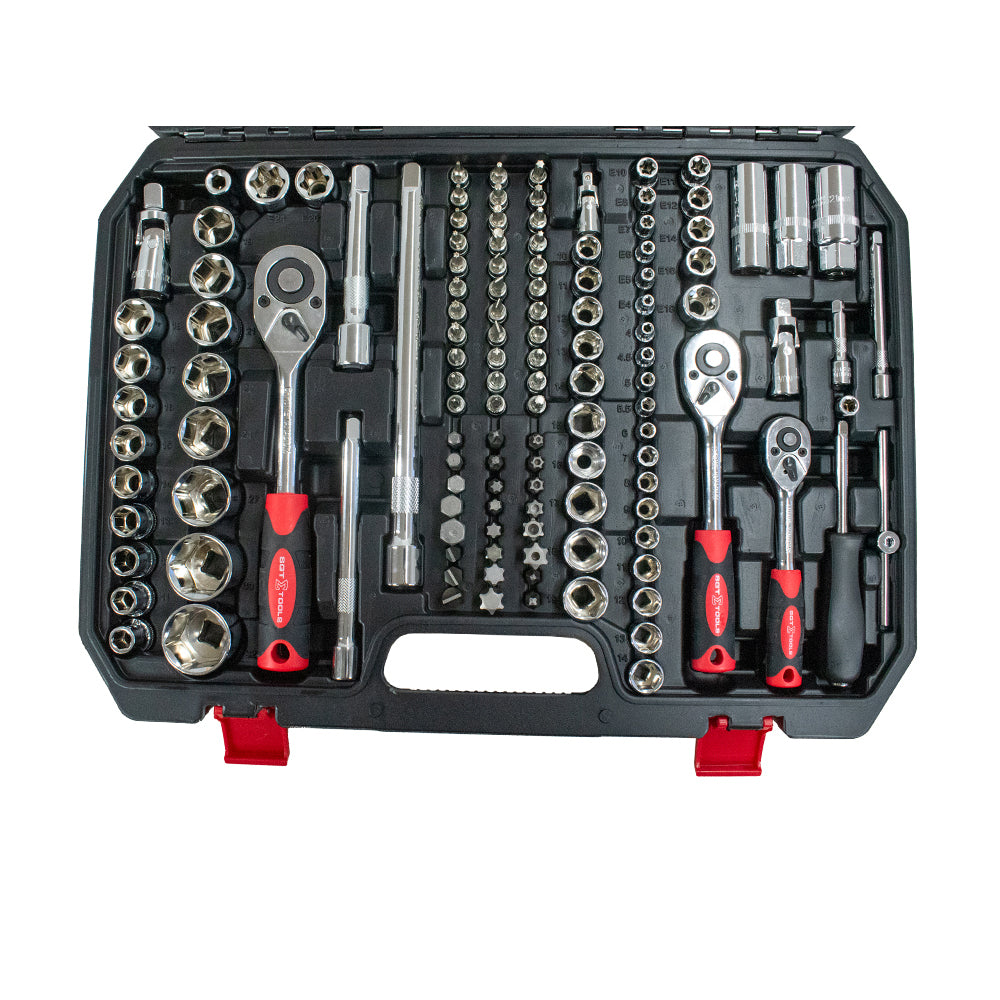 >05 acessórios: Extensão 125mm (5″), Catraca reversível, Corpo para cabo T, Junta Universal e Adaptador para bits (3/8″ para 1/4″).