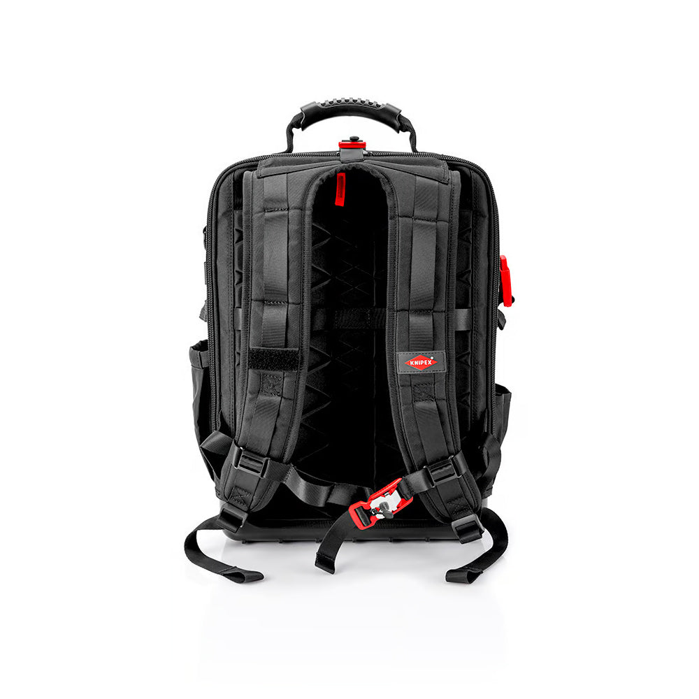 >A mochila oferece 21 alças de retenção, 37 bolsos, um painel de ferramentas removível e parte traseira acolchoada para maior conforto ao usá-la