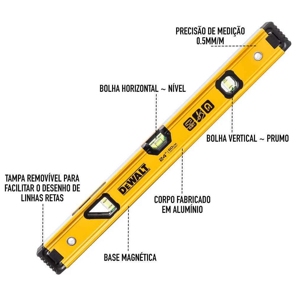 Nível confeccionado em alumínio, o que traz inúmeras características especiais para essa ferramenta de medição, além de ser resistente à umidade, calor e temperaturas baixas. O Nível de Alumínio 24'' com 3 Bolhas e Base Magnética Dewalt possui precisão excepcional de 0.5 mm/m.