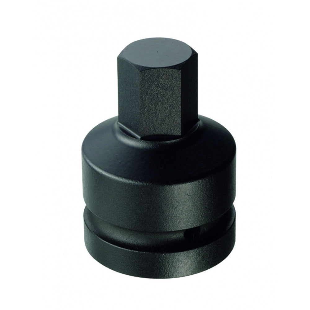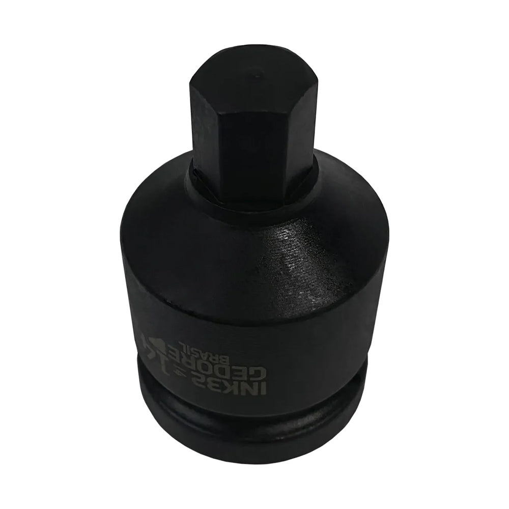 Aço-liga de alta resistência mecânica. Com acabamento escurecido. Soquete extrarresistente, para trabalhar com máquinas de impacto, com encaixe quadrado externo 19,05 mm (3/4”), conforme DIN 3121 - G 20, ISO 1174. Indicada para parafusos com perfil de encaixe sextavado interno. Permite introduzir e remover o parafuso de forma rápida. Possui alojamento para utilização de pino e anel de segurança, a serem adquiridos à parte, conforme tabela abaixo.
